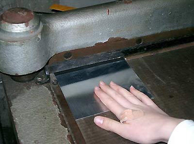 Zunächst wird die Zink- oder Kupferplatte mit der Metallhacke in das richtige Format gebracht.